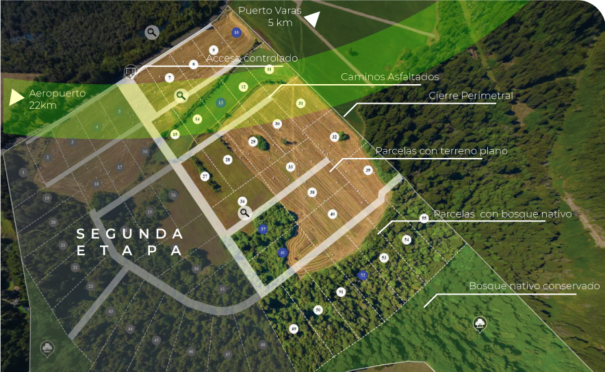- Sub-división en 52 parcelas de 5000 mts2, urbanizadas con camino de ripio, agua potable rural a través de pozo del mismo loteo, canalización subterránea de servicios, iluminación vial, y conectividad a través de fibra óptica.